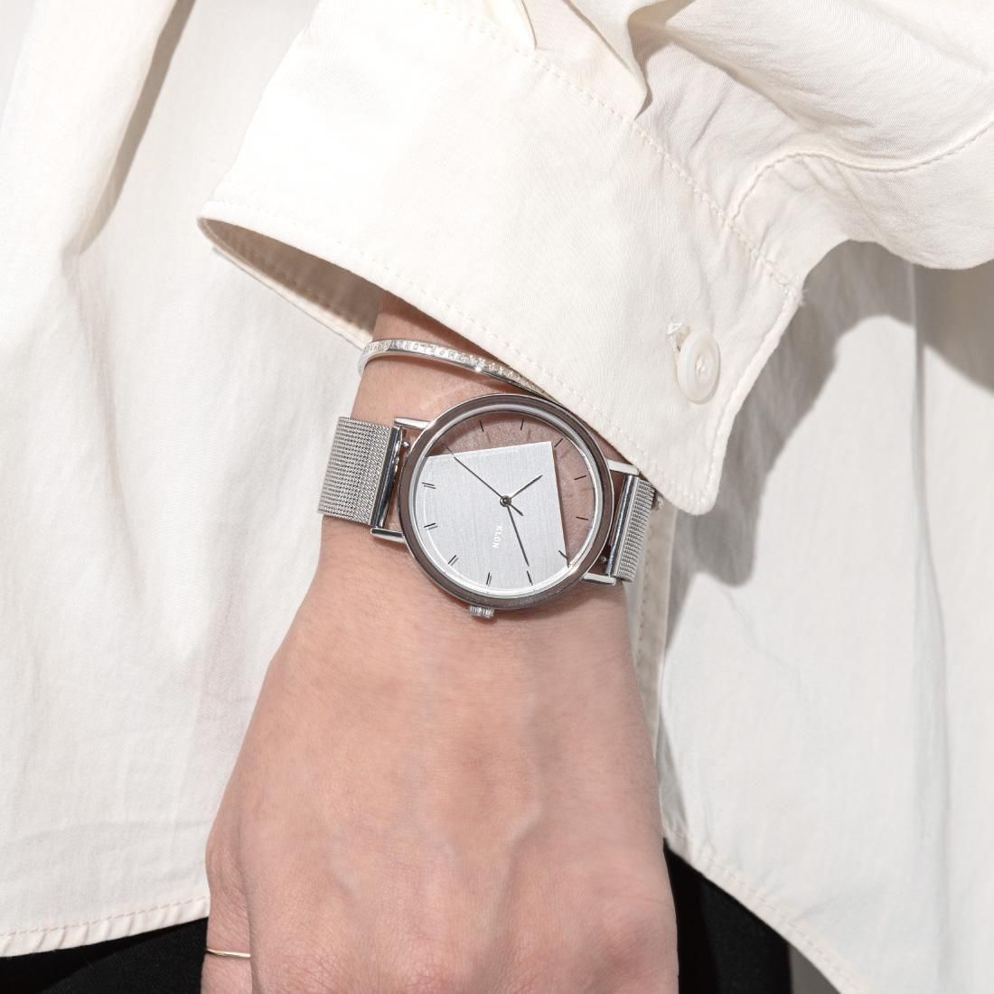 文字盤の丸に、絶妙なバランスで四角の要素を組み合わせたモードな印象の腕時計。