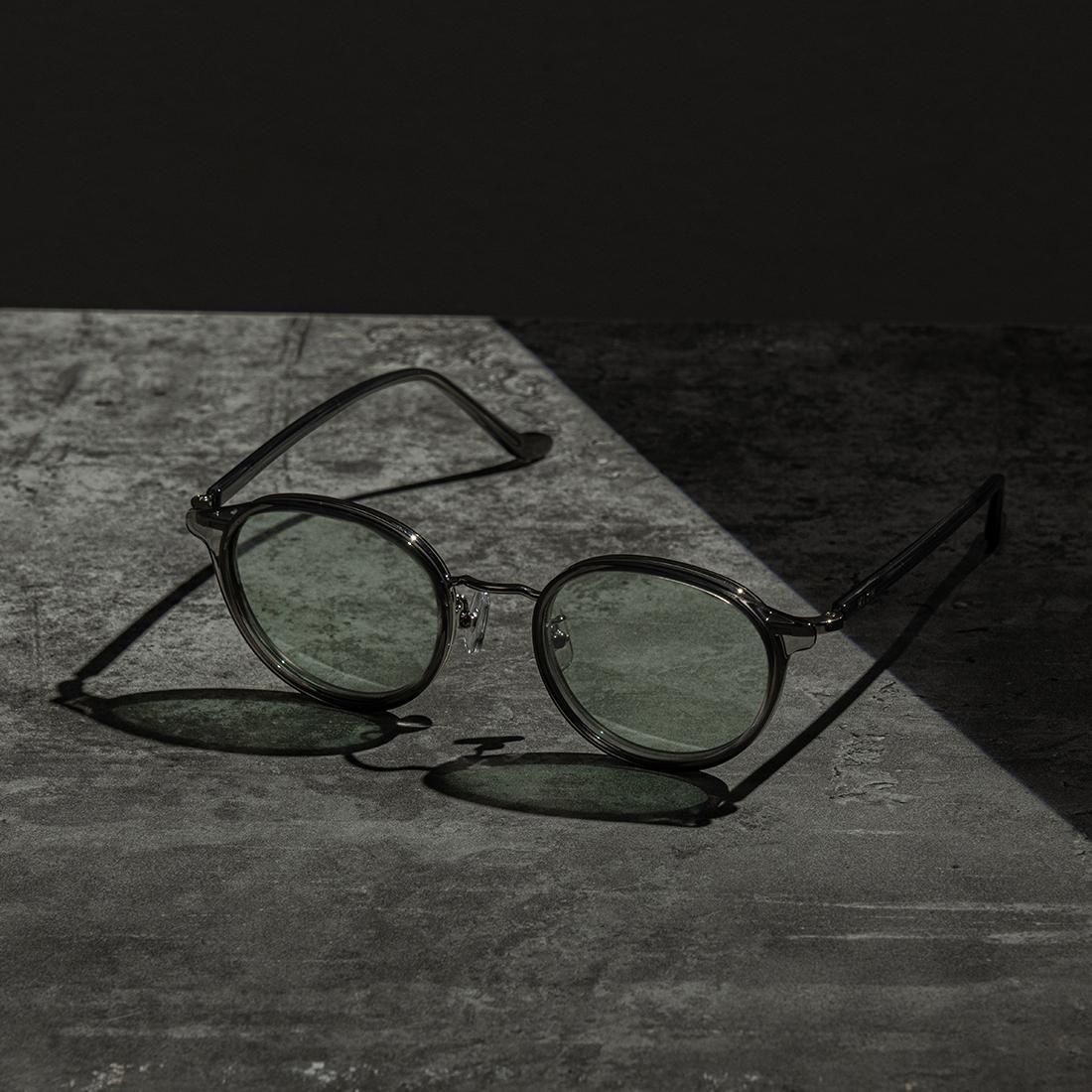 透明感のあるグレーフレームに爽やかなミントレンズの組み合わせが、柔らかく清涼感のある印象でスタイリングを軽やかに彩ります。